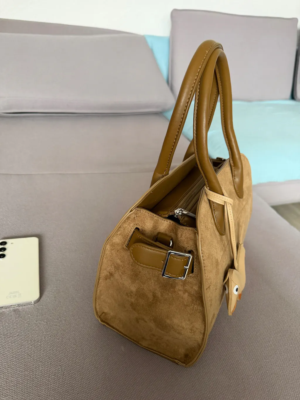 Diese edle Handtasche vereint hochwertiges Veloursleder mit glatten Leder-Details. Ein echtes Statement-Piece für Frauen, die Wert auf Stil und Qualität legen.